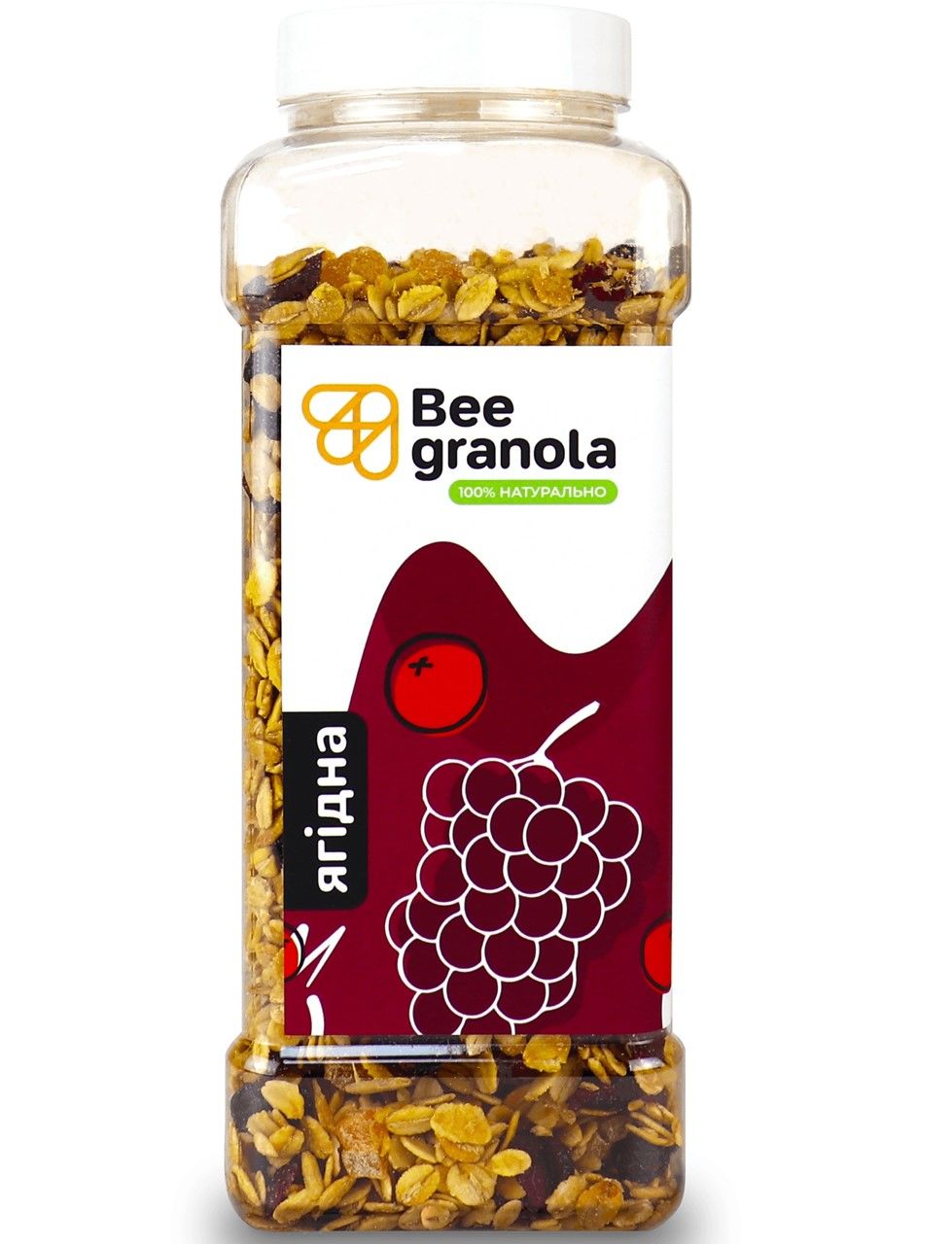 Складається з запечених хрустких вівсяних пластівців та не менше ніж 40% сушених ягід та фруктів.