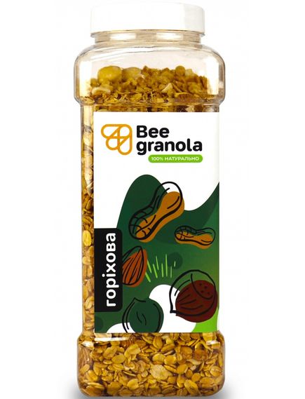 Склад: пластівці вівсяні, пластівці пшеничні, пластівці ячмінні, мед натуральний, кеш’ю, арахіс, мигдаль, фундук, олія кокосова, глюкозно-фруктозний сироп, вода питна, сіль.