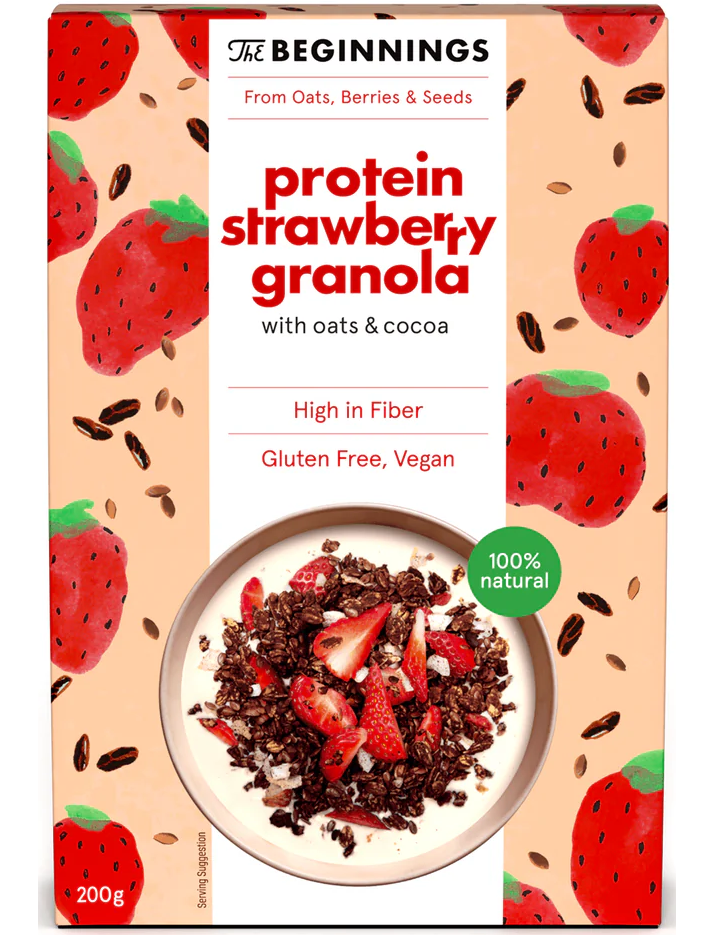 Strawberry Protein Granola виготовляється з рослинного білка гороху. Овес без глютену був змішаний разом із сублімованою полуницею та какао, природно підсолодженим сиропом агави. Легке, але ситне натуральне харчування, воно підготовлене для легкого використання.