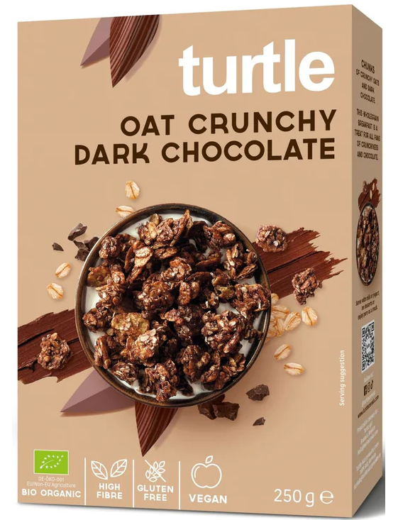 Насолоджуйтесь мискою хрусткого темного шоколаду Turtle Oat: смачні випечені мюслі з густим тістом та добрим темним шоколадом.