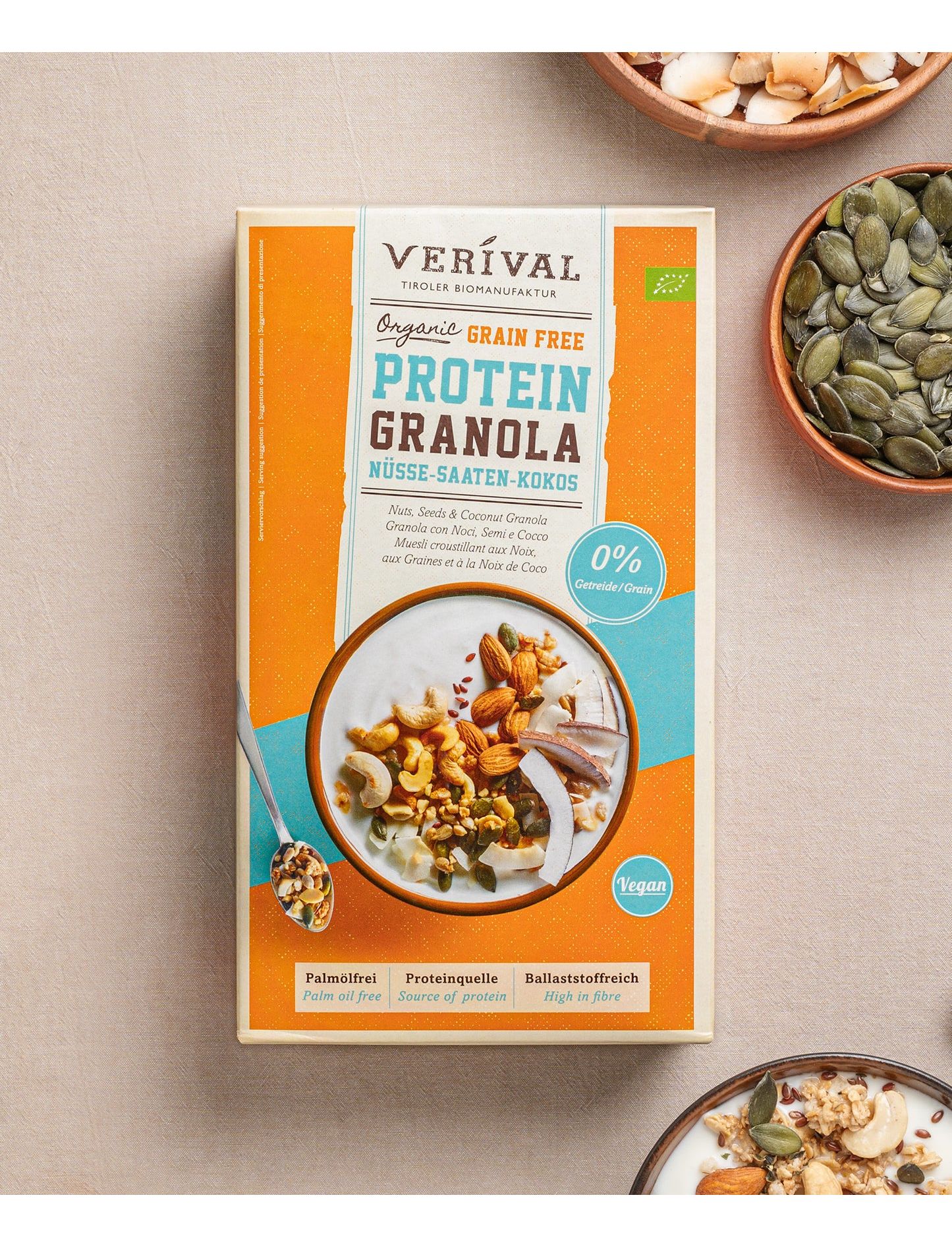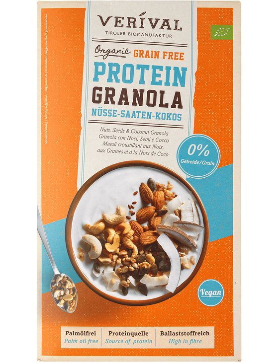 Наша чудова беззернова гранола з горіховим вмістом гарантує бадьорий початок дня – без зернових або сухофруктів. Високоякісна суміш смаженого мигдалю, гарбузового та соняшникового насіння, кешью, насіння льону та кокоса забезпечує здоровими жирами, великою кількістю рослинних білків і клітковини. Завдяки низькому вмісту вуглеводів гранола також ідеально підходить для дієти з низьким вмістом вуглеводів. Щіпка кориці та нотка кленового сиропу ідеально доповнюють смак. Нам вдалося досягти приємної солодкої нотки, зберігаючи дуже низький вміст цукру. Насолоджуйтеся хрускітом – без докорів сумління.