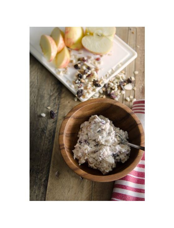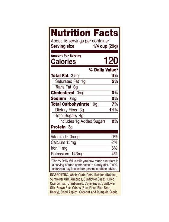Склад: цільнозерновий безглютеновий овес, родзинки, насіння соняшнику, сушена журавлина (журавлина, цукор, соняшникова олія), сушені яблука, коричневі рисові чіпси (рисове борошно, рисові висівки, мед, карбонат кальцію), мигдаль, кокос І гарбузове насіння.