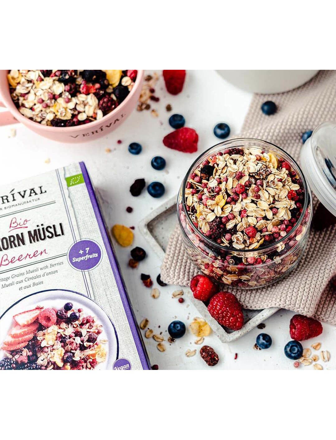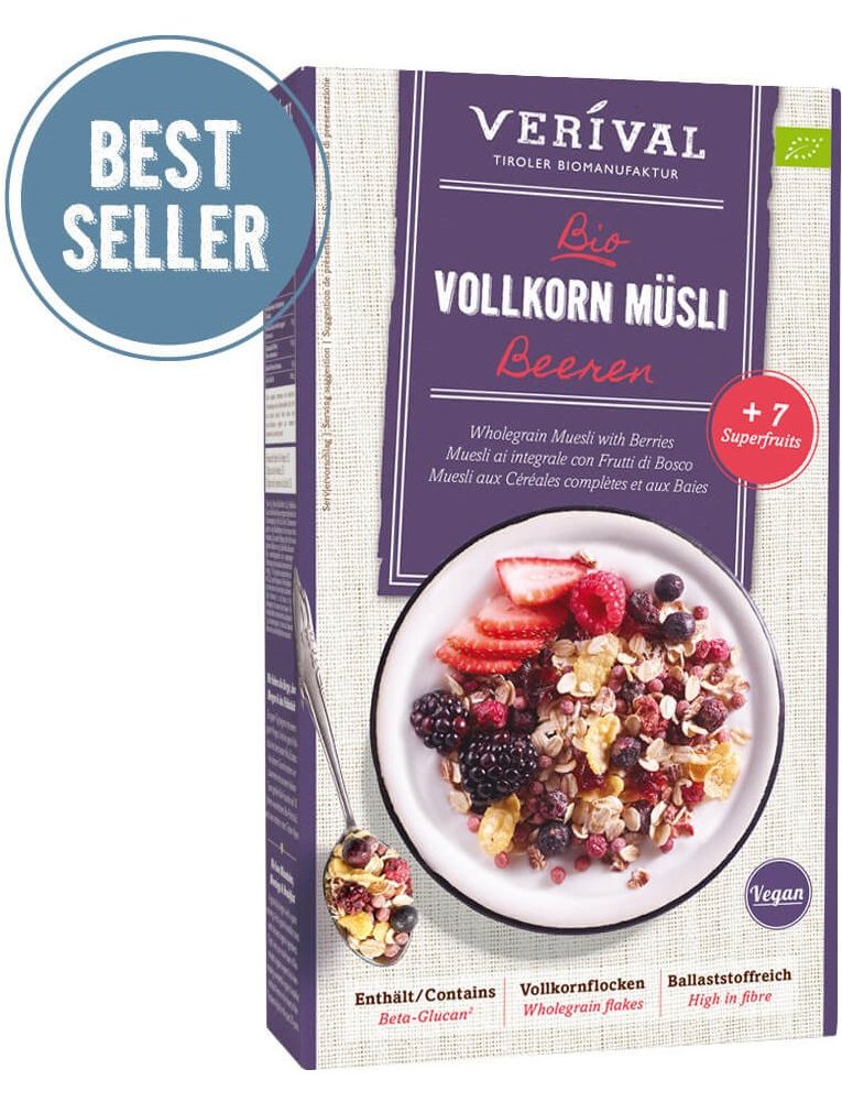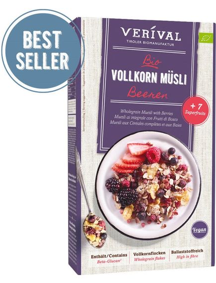 Цільнозернові мюслі багаті клітковиною завдяки високому вмісту цільнозернового вівса та цільнозернової пшениці Verival. Вони забезпечують здорове травлення, а також тривале відчуття ситості та забезпечують організм великою кількістю енергії. Ягоди також містять велику кількість вітамінів і мінералів, які підтримують всі процеси в організмі. Цільнозернові мюслі з ягодами ідеально підходять для збалансованого та здорового сніданку.