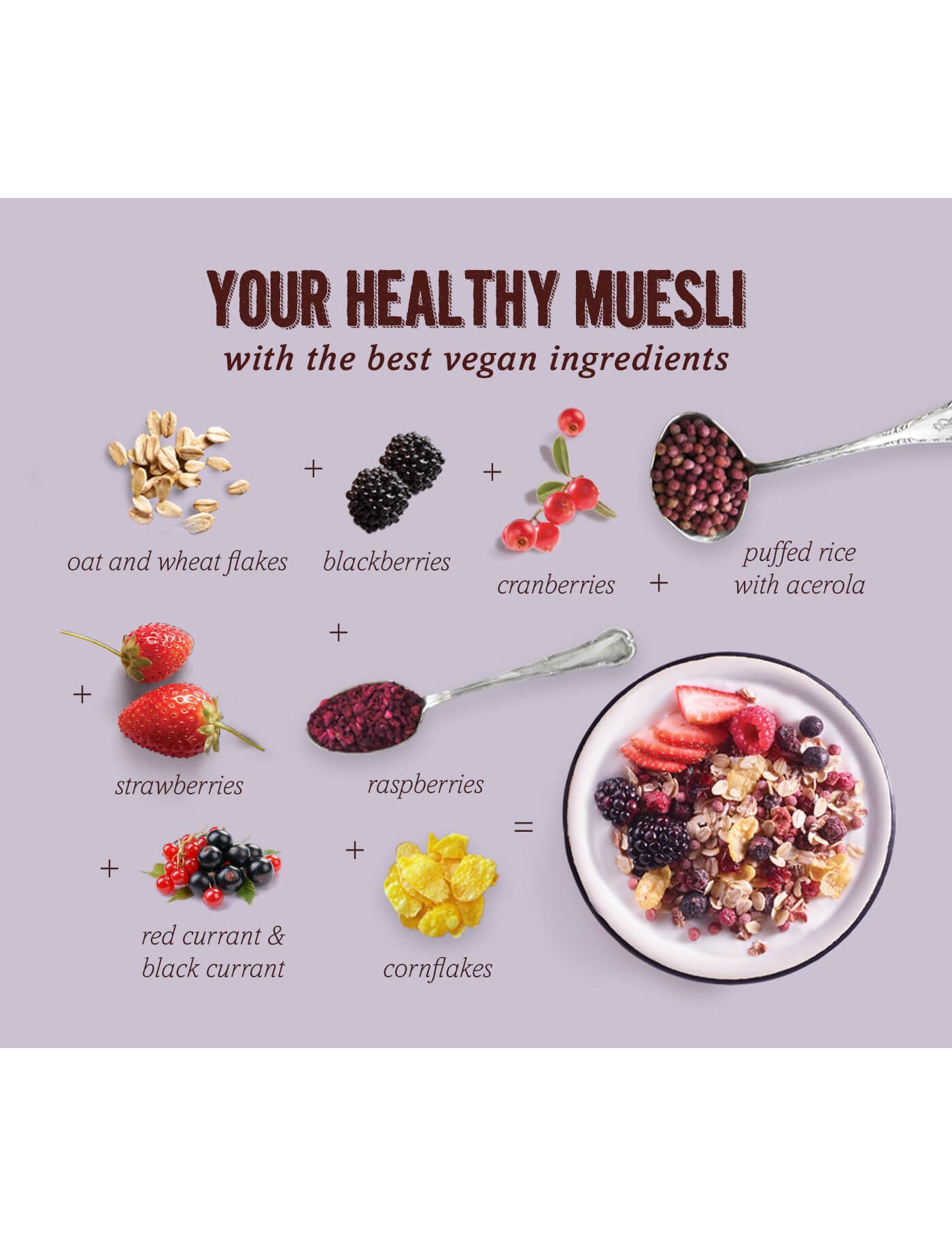 Ваш ягідний сніданок із додатковою кількістю поживних речовин: 100 г цільнозернових мюслі забезпечують 21% вашої добової потреби клітковини, 20% необхідних білків і всіх незамінних амінокислот, важливих вітамінів і мінералів.