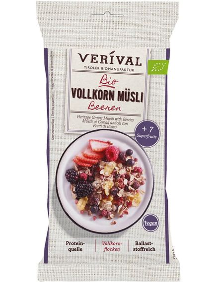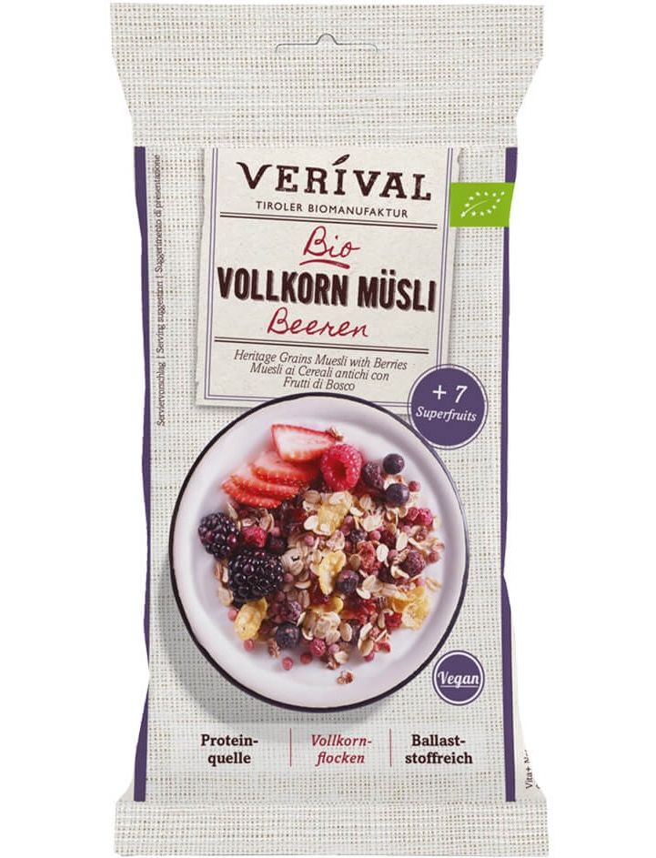 Цільнозернові мюслі багаті клітковиною завдяки високому вмісту цільнозернового вівса та цільнозернової пшениці Verival. Вони забезпечують здорове травлення, а також тривале відчуття ситості та забезпечують організм великою кількістю енергії. Ягоди також містять велику кількість вітамінів і мінералів, які підтримують всі процеси в організмі. Цільнозернові мюслі з ягодами ідеально підходять для збалансованого та здорового сніданку.