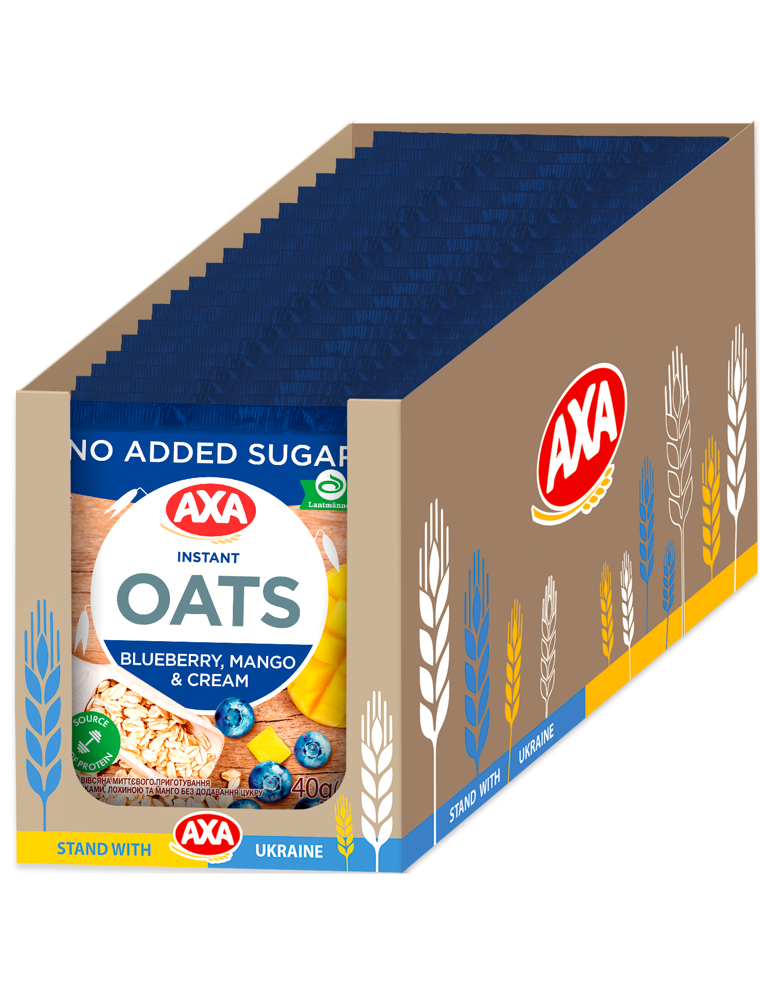 Склад: пластівці вівсяні 86,3%, вершки сухі 10%, суміш шматочків лохина-манго сублімовані 3,0%, сіль кухонна, ароматизатор «ваніль».Може містити залишки слідів арахісу, горіхів та сої.