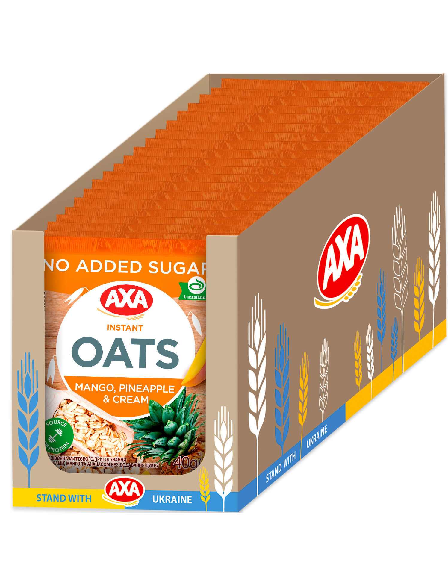 пластівці вівсяні 86,3%, вершки сухі 10%, суміш шматочків манго- ананас сублімовані 3,0%, сіль кухонна, ароматизатор «ваніль».Може містити залишки слідів арахісу, горіхів та сої.