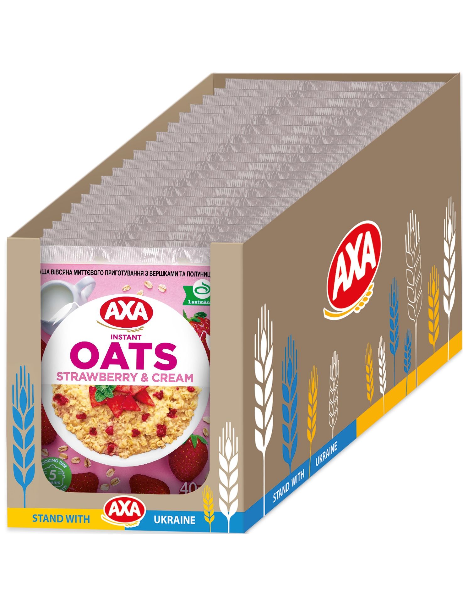 Склад: пластівці вівсяні, цукор, вершки сухі 10%, шматочки сублімованої полуниці 2,5%, сіль кухонна, ароматизатор «ваніль».