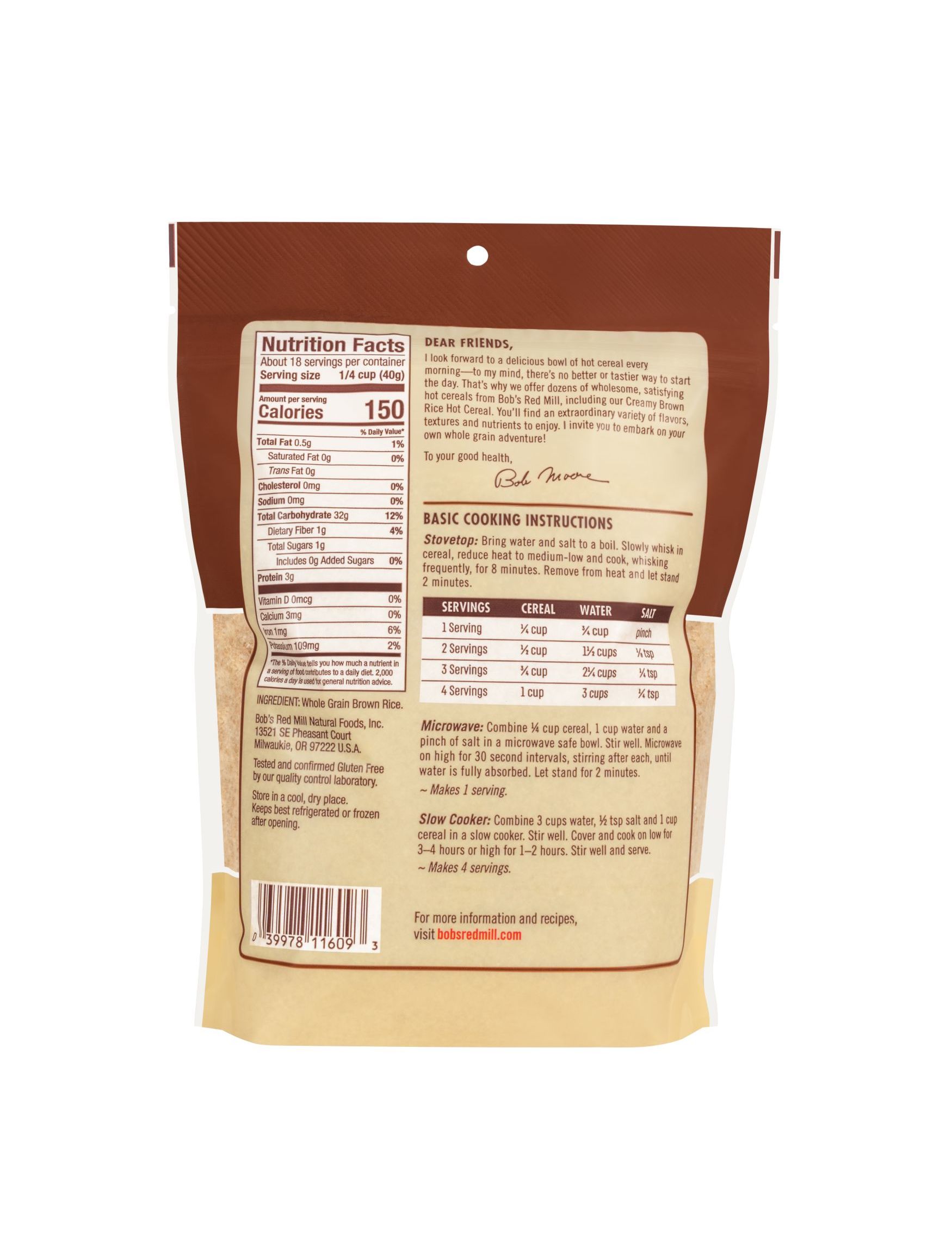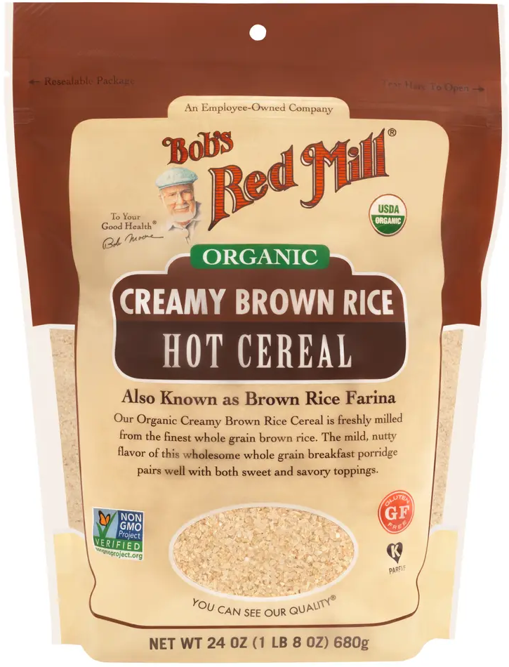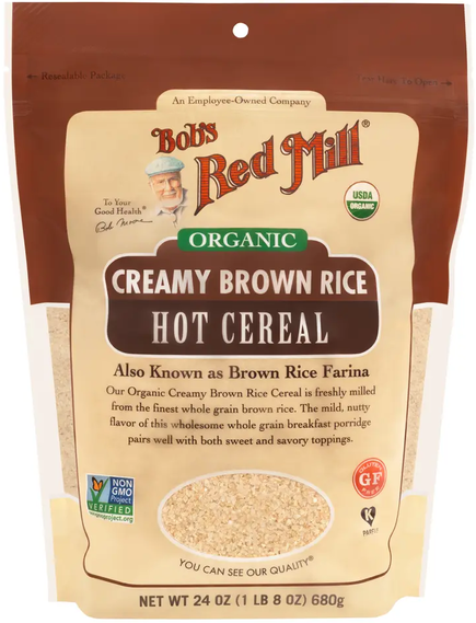 Bob's Red Mill Creamy Brown Rice Hot Cereal — це цільнозернові каші у своєму найкращому вигляді. Ми беремо високоякісний каліфорнійський коричневий рис і нарізаємо його на кілька шматочків, щоб отримати задовільну м’яку крупу з м’яким смаком. Цю корисну рисову кашу люблять і дорослі, і діти. Він також не містить глютену, тому це чудовий варіант для людей з целіакією або непереносимістю глютену.