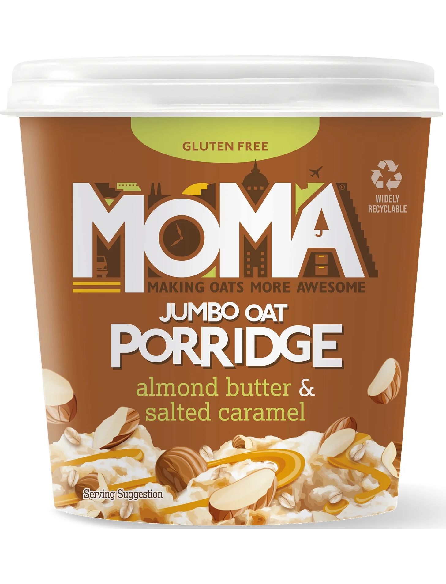 Наші відзначені нагородою «Чудовий смак» каші з мигдальним маслом і солоною карамеллю ідеально підходять для смачного веганського сніданку без глютену в дорозі.