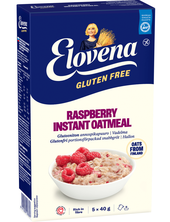 Безглютенова каша швидкого приготування зі смаком малини – це смачний варіант для сніданку, обіду, перекусу чи вечері. Досить додати окропу, і каша готова до вживання. Порційну сумку також зручно брати з собою. Продукт виробляється у Фінляндії з фінського вівса, і його було нагороджено етикеткою Heart Label, що означає, що він є більш здоровим вибором у власній групі продуктів. Багатий клітковиною.
