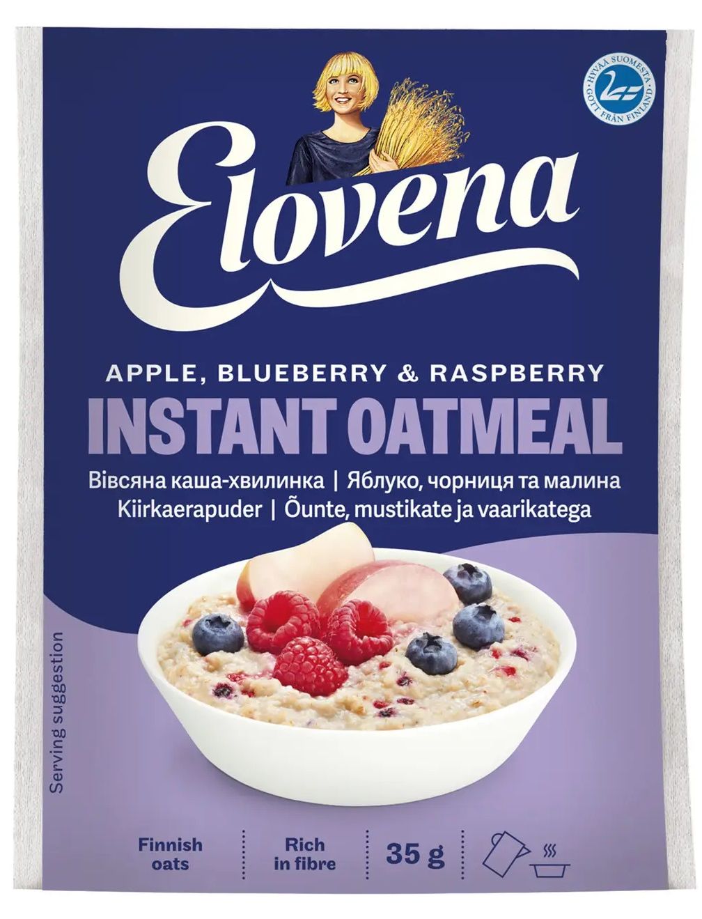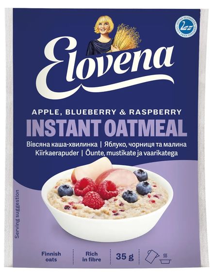 Каша з яблуком, чорницею і малиною моментального приготування — це швидко, корисно і смачно! Вона не вимагає варіння, досить залити невеликою кількістю окропу і дати настоятися кілька хвилин. Натуральні фрукти і ягоди надають традиційної вівсяної каші особливий смак. У кожній коробці — 30 порцій в індивідуальній упаковці. Продукт не містить штучних консервантів, ароматизаторів та барвників.