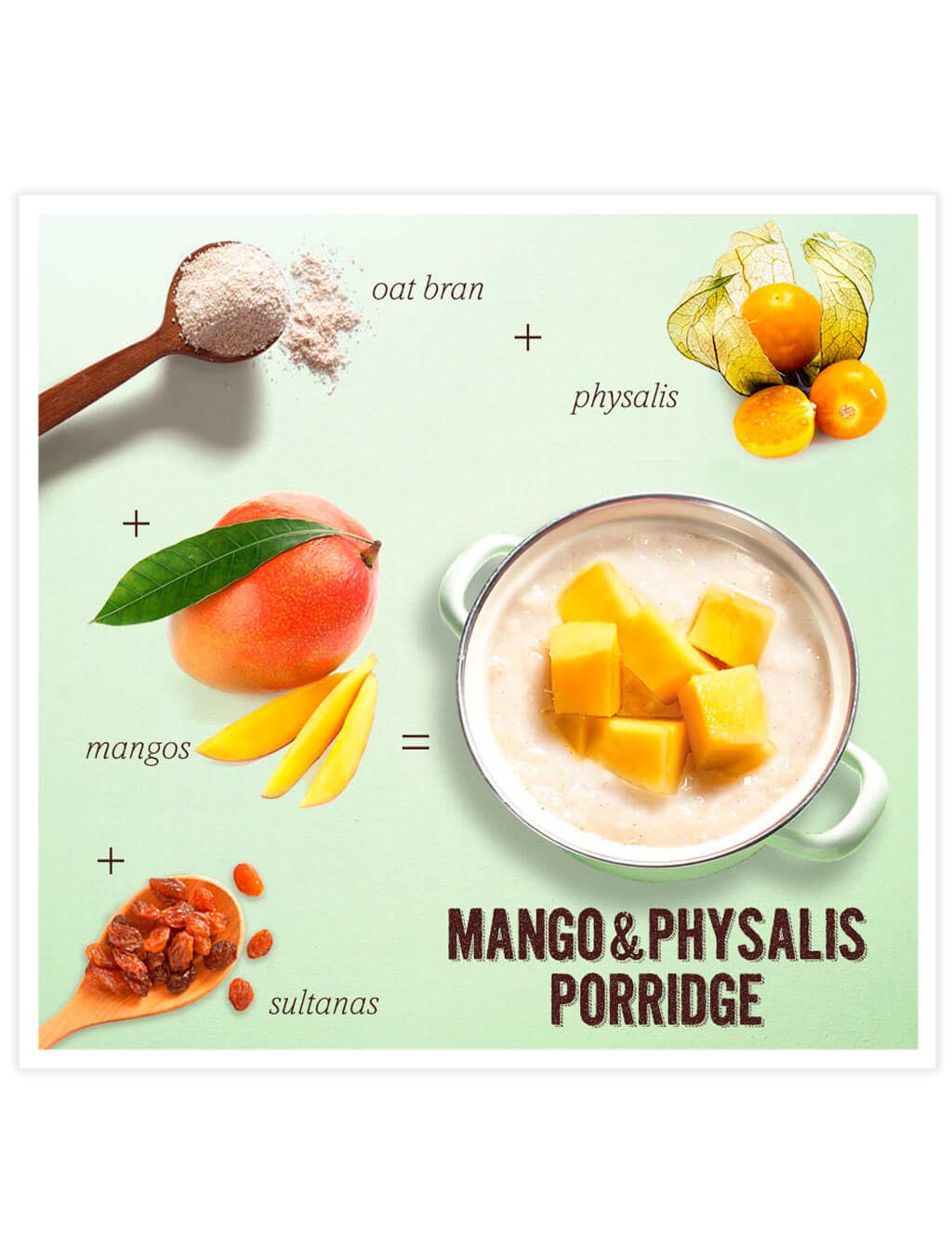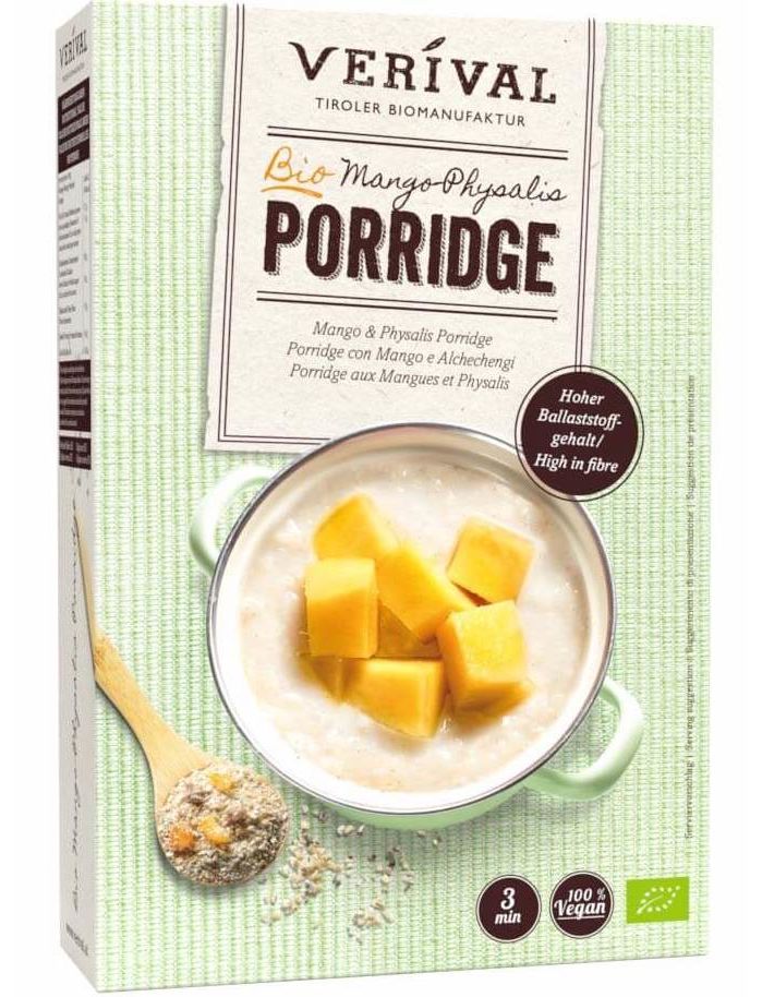 Склад: вівсяні висівки* 78%, гранулят манго* 7% (фрукти* (пюре манго* 30,5%, концентрат яблучного пюре*), фруктозний сироп*, необроблений тростинний цукор*, рисове борошно*, масло какао*, желюючий агент: пектин ; вівсяна клітковина*; концентрат лимонного соку*), султани* ( султани* 99,5%, соняшникова олія*), сушене манго* 4% (манго* 90%, рисове борошно*), сушений фізаліс* 4% (фізаліс* 97%, рисове борошно*), фініковий гранулят* (концентрат фінікового соку*, рисове борошно*). *Сертифікований органічний