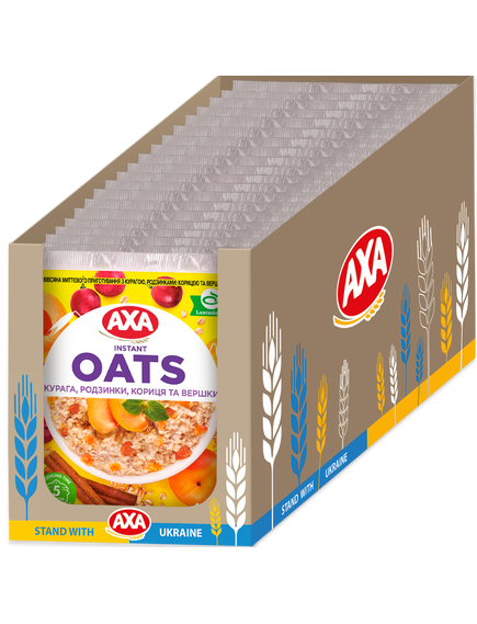 Склад: пластівці вівсяні 64,2%, цукор, вершки сухі 8,0%, шматочки кураги 5% (курага сушена, рисове борошно), родзинки сушені 5%, борошно вівсяне, сіль кухонна, кориця мелена 0,2%, ароматизатор «ваніль».