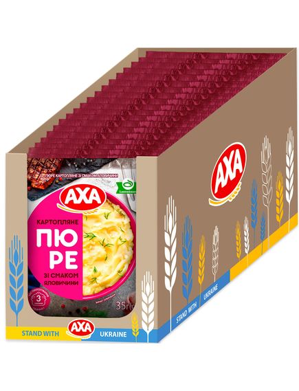 Склад: пластівці картопляні 66,45% (картопля сушена 99,4%, емульгатор моно – та дигліцеридів жирних кислот, стабілізатор пірофосфат натрієвої кислоти, антиоксидант аскорбілпальмітат, регулятор кислотності лимонна кислота, консервант метабісульфіт натрію), замінник вершків на рослинній основі (сироп глюкозний, гідрогенізована рослинна олія (соняшникова, пальмова), казеїнат натрію, стабілізатори: фосфат калію, поліфосфат, емульгатор моно- та дигліцерідів жирних кислот, антиспікаючий агент Е 554), мальтодекстрин, суміш смако-ароматична яловичина 4,0% (сіль кухонна, цукор, мальтодекстрин, підсилювачі смаку та аромату: глутамат натрію, інозинат натрію, гуанілат натрію, ароматичні компоненти, натуральні ароматичні речовини, олія соняшникова, барвник екстракт паприки, антиспікаючий агент діоксид кремнію), сіль кухонна, кріп сушений 1,0%, часник сушений 1,0%, перець чорний мелений. Може містити залишки злаків, що містять глютен, арахісу, горіхів, сої.