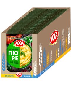 Виготовлено в Україні. Унікальна рецептура. Взяти з собою та легко приготувати. Склад: пластівці картопляні 66,9% (картопля сушена 99,4%, емульгатор моно – та дигліцеридів жирних кислот, стабілізатор пірофосфат натрієвої кислоти, антиоксидант аскорбілпальмітат, регулятор кислотності лимонна кислота,  консервант метабісульфіт натрію), замінник вершків на рослинній основі (сироп глюкозний, гідрогенізована рослинна олія (соняшникова, пальмова), казеїнат натрію, стабілізатори: фосфат калію, поліфосфат, емульгатор моно -та дигліцерідів жирних кислот, антиспікаючий агент Е 554),  мальтодекстрин, суміш смако-ароматична курка 3,5% (сіль кухонна, мальтодекстрин, цукор, підсилювачі смаку та аромату: глутамат натрію, інозинат натрію, гуанілат натрію, ароматичні компоненти, натуральні ароматичні речовини, олія соняшникова, барвник екстракт куркуміну, антиспікаючий агент діоксид кремнію), сіль кухонна, кріп сушений 1,0%, часник сушений1,0%, перець чорний мелений. Може містити залишки злаків, що містять глютен, арахісу, горіхів, сої.