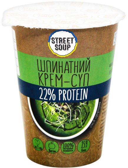 Шпинатний крем-суп Street Soup 50 г в стакані - це натуральний крем-суп миттєвого приготування в зручному паперовому стакані!