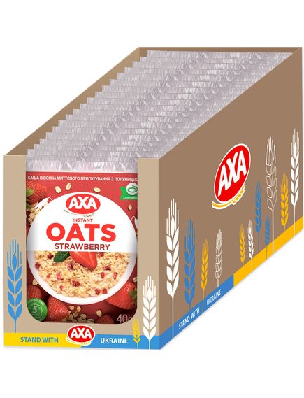 Склад: пластівці вівсяні 72 %, цукор, шматочки сушеної полуниці 3 %, суха молочна сироватка, сіль кухонна, ароматизатор «ваніль».