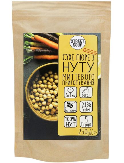 Сухе Нутове пюре Street Soup миттєвого приготування 250 г в дой-пак упаковці з zip-lock - це новий натуральний продукт миттєвого приготування у зручній упаковці з zip-замком для зручного зберігання!