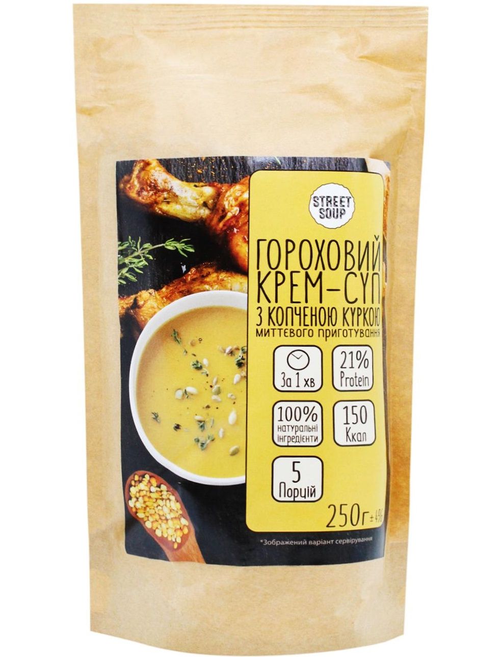 Гороховий крем-суп з копченою куркою Street Soup 250 г в дой-пак упаковці з zip-lock - це натуральний крем-суп миттєвого приготування в упаковці з zip-замком для зручного зберігання!