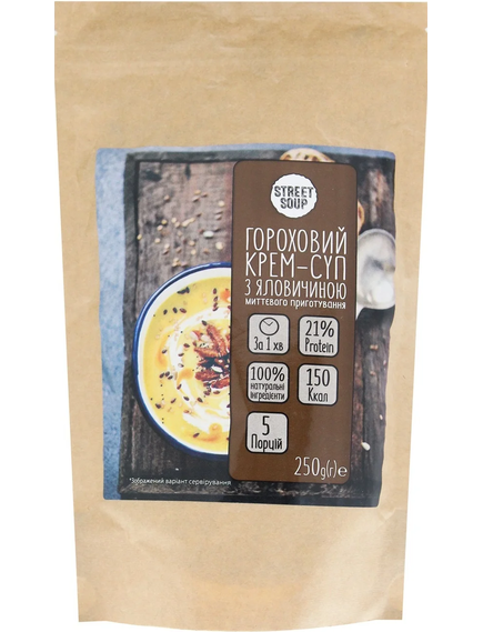 Гороховий крем-суп з яловичиноюStreet Soup 250 г в дой-пак упаковці з zip-lock - це натуральний крем-суп миттєвого приготування в упаковці з zip-замком для зручного зберігання!