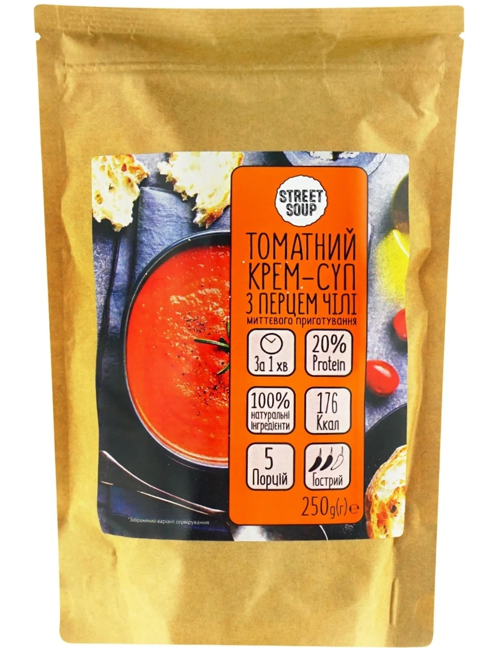 Томатний з перцем чілі крем-суп Street Soup - це натуральний суп миттєвого приготування.