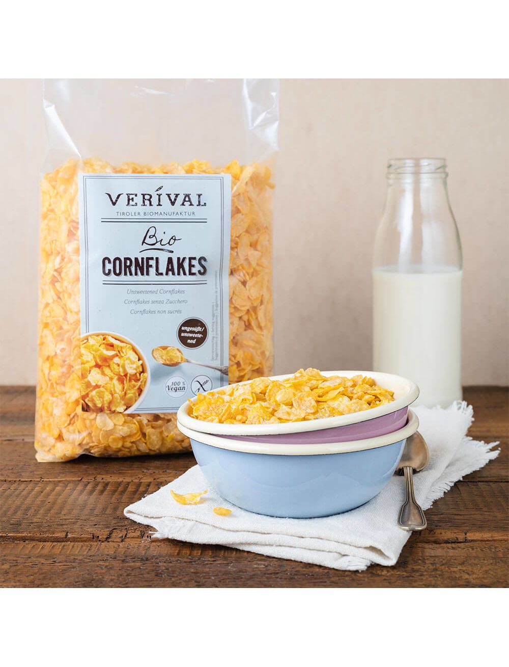 Кукурудза обережно висушується на повітрі в сушильній установці та механічно очищається від будь-яких домішок; потім його відокремлюють від зародків і лушпиння в кукурудзяному млині і розбивають на шматки однакового розміру. Пластівці виготовляють традиційним процесом варіння, сушать, розкачують у ніжні пластівці та обсмажують. Лише завдяки цьому ретельному процесу пластівці розвивають свій повний і незрівнянний смак. Вони не виготовляються методом екструзії! (Процес формування, під час якого тісто під високим тиском формується в потрібні форми).