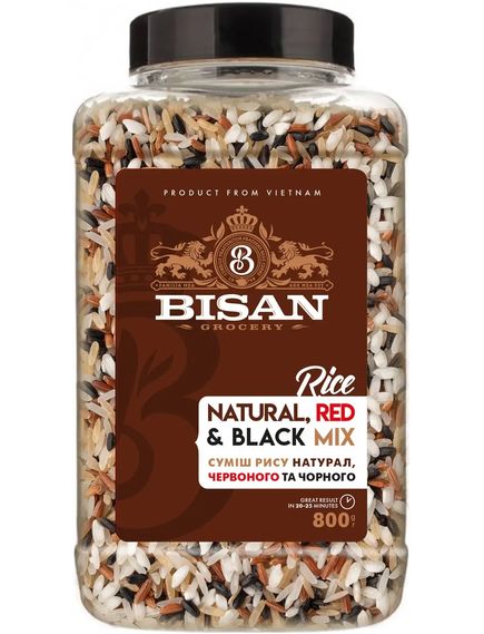 Склад: рис Натуральний довгозернистий нешліфований 60%, рис Червоний довгозернистий нешліфований 25%, рис Чорний довгозернистий нешліфований 15%.