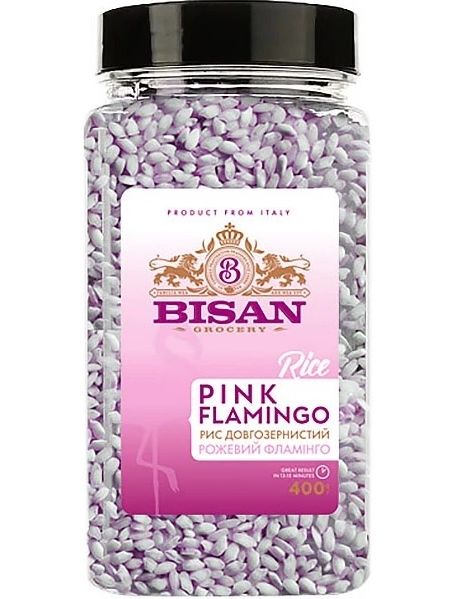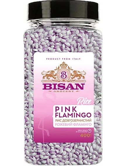 Bisan Pink Flamingo – вишуканий італійський довгозернистий рис з природним рожевим відтінком. Має м'який смак і тонкий аромат, відмінно зберігає форму після варіння. Підходить для гарнірів, салатів, страв азійської та середземноморської кухні.