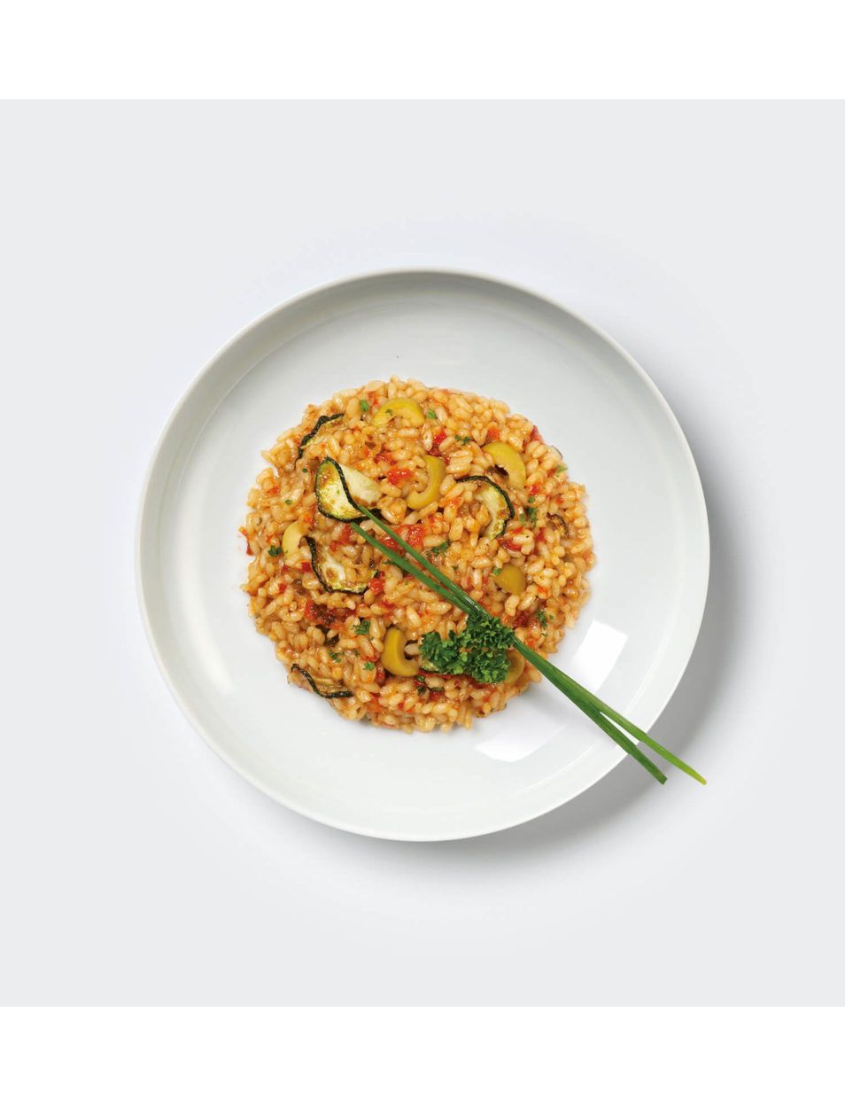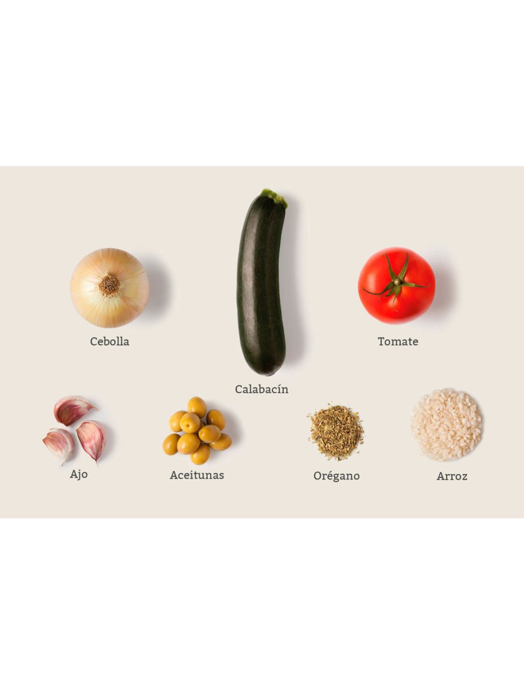 Склад: рис, помідори, цукіні, часник, оливки, цибуля, орегано.