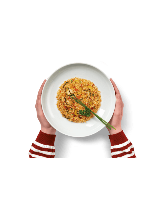*На одну особу приблизно 95 г нашого Різотто та 300 мл води. Не забудьте струсити лоток перед тим, щоб отримати однорідну суміш.