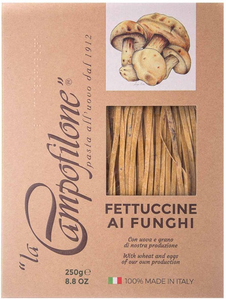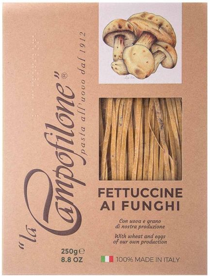 Фетучіні з білими грибами від La Campofilone — це традиційна італійська яєчна паста, виготовлена з борошна з твердих сортів пшениці, вирощеної на власних полях компанії в долині Марке. Яйця, яких у складі цих макаронних виробів має бути не менше 30 %, походять з ферми, що належить бренду. Тут кури перебувають на вільному вигулі та харчуються лише високоякісними збалансованими кормами. Крім цього, паста збагачена натуральними сушеними білими грибами, що додає їй неповторного аромату. Фетучіні необхідно готувати в окропі протягом 1–2 хвилин. Готовий продукт має витончений смак з грибними нотами та щільну еластичну консистенцію. Ідеально поєднується з вершковим соусом. La Campofilone — це бренд, який уже понад 100 років спеціалізується на виготовленні макаронних виробів. Сьогодні це компанія, яка створює пасту із натуральних інгредієнтів власного виробництва, підтримуючи сільське господарство та плекаючи традиції італійської кухні.