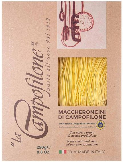 Хочете насолодитися смаком справжньої італійської пасти? Спробуйте макерончині La Campofilone з якісного борошна із твердих сортів пшениці та фермерських яєць. Бренд піклується про природу й використовує для своїх продуктів лише екологічно чисті компоненти. La Campofilone виготовляє пасту за традиційними рецептами вже більше ніж 100 років. Його команда стверджує, що секретом неперевершеного смаку є якісні інгредієнти плюс дрібка любові. За формою макерончині схожі на спагетті, але тонші. Найкраще смакують із мʼясним або томатним соусом, оливковою олією та овочами гриль.