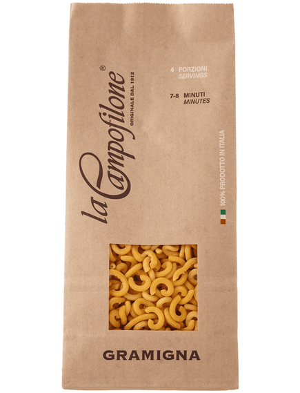 Паста сімейного італійського бренду La Campofilone — якісний та смачний продукт, виготовлений за класичною рецептурою. Секрети компанії полягають у дотриманні багатолітніх традицій приготування пасти й використанні екологічно чистих продуктів: яєць від курей, вирощених на натуральних кормах, та манної крупи з органічної пшениці. Паста грамінья La Campofilone має вигляд маленьких вигнутих трубочок. Така форма покращує поглинання й утримання соусу, що робить смак страв насиченим. До пасти грамінья особливо пасують мʼясні та вершкові соуси.