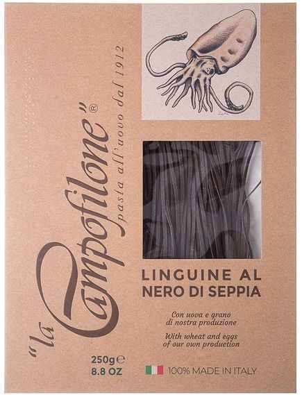 Екстравагантна паста лінгвіні з чорнилом каракатиці відрізняється насиченим чорним кольором і легким морським присмаком. Компанія La Campofilone піклується про природу, тому готує пасту лише з екологічно чистих компонентів за старовинною італійською технологією, коли листи тіста сушаться повільно й поступово. Інгредієнти продукту: органічна пшениця та яйця місцевих фермерських курей. Лінгвіні з чорнилом каракатиці добре поєднується з морепродуктами (креветками, кальмарами, вонголе), вершковими й часниковими соусами, оливковою олією.