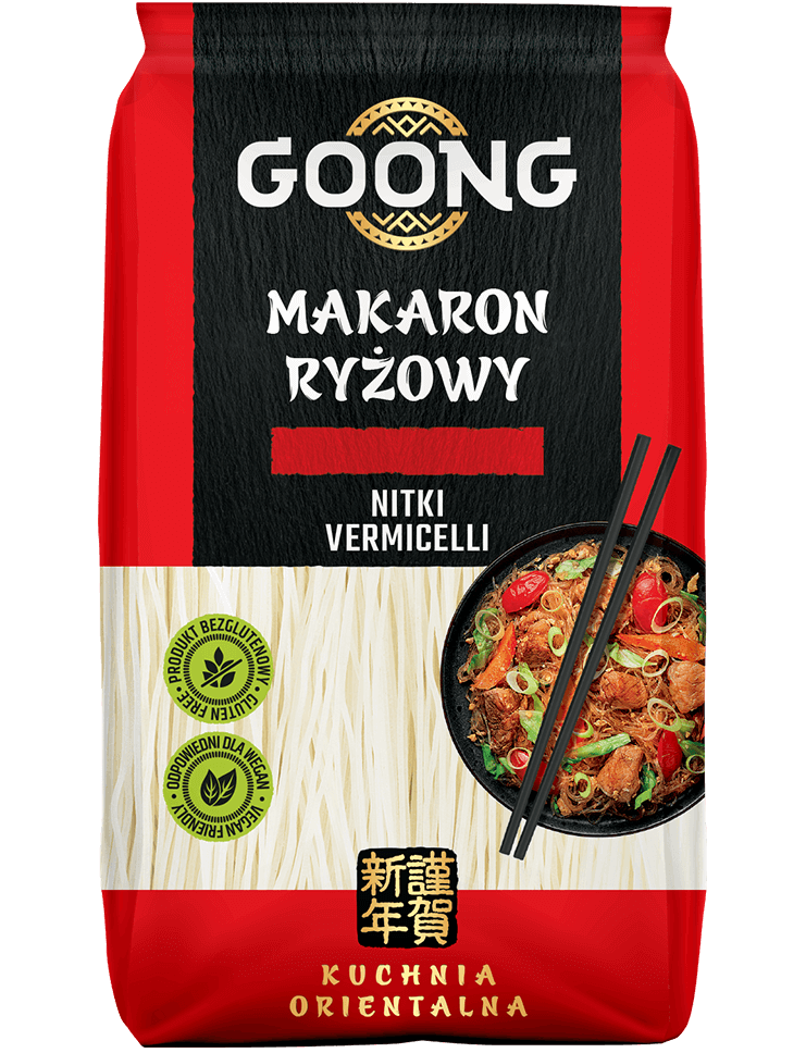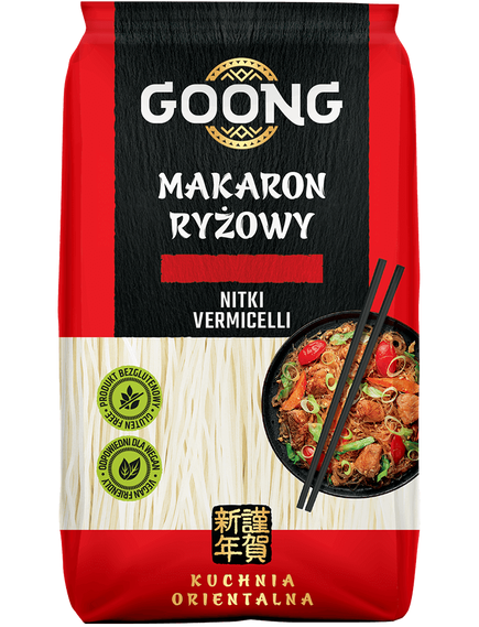 Рисова локшина Goong з вермішеллю є чудовим доповненням до азіатських страв тощо. Їх надзвичайно простий склад (тільки рисове борошно та вода) гарантує найвищу якість продукту. Рисова локшина Goong не містить глютену, що робить її безпечною для людей з целіакією. Вони чудово доповнюють супи та чудово поєднуються з овочами, морепродуктами та м’ясом. Оскільки вони дуже легкі, локшина готова практично миттєво – просто залийте окропом і почекайте кілька хвилин.