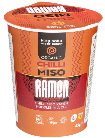 Швидка, смачна чашка з локшиною, ідеальна, якщо ви в дорозі! Органічна локшина рамен з коричневого рису та суп місо з чилі. Готовий менш ніж за 5 хвилин!