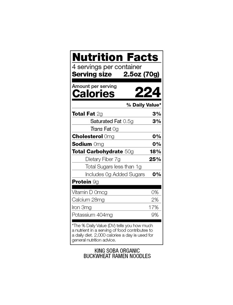 Допоможіть собі поживну миску локшини рамен, яку традиційно подають у бульйоні місо та додають усе, що вам подобається! Наш органічний гречаний рамен King Soba виготовляється зі 100% органічної гречки. Дуже поживний, цей рамен є чудовим джерелом вуглеводів із повільним вивільненням і легкозасвоюваних білків. Чудова альтернатива пшеничним продуктам, будучи дуже ситною їжею з місо, овочами, тофу або м’ясом.