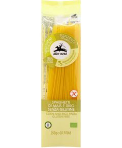 Склад: кукурудзяне борошно* (80%), рисове борошно* (20%). *Органічне Органічні безглютенові спагетті Alce Nero виробляються тільки з органічної кукурудзи та рису, вирощених в Італії. Рецепт спагетті був розроблений для досягнення правильного балансу смаків між білою та жовтою кукурудзою...
