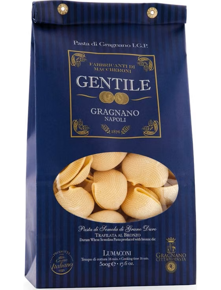 Gentile Паста Лумаконі – це традиційна італійська паста великого формату, що нагадує за формою равлика (lumaca). Завдяки своїй унікальній структурі, вона ідеально підходить для фарширування та запікання. Виробляється у Граньяно, Італія – місті, яке славиться пастою найвищої якості та має статус IGP (Indicazione Geografica Protetta), що гарантує автентичність та дотримання традиційних методів виготовлення.