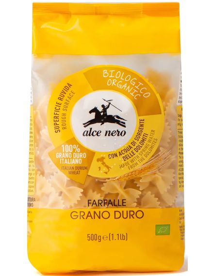 Фарфалле Alce Nero - органічна паста, виготовлена на основі борошна з італійської пшениці твердих сортів та джерельної води з Трентінських Альп. Створена у бронзовій матриці.