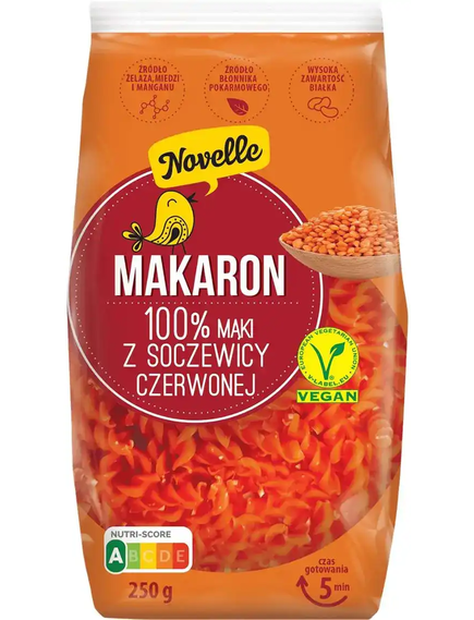 Макарони Novelle Спіралі із червоної чечевиці – це корисний і поживний продукт, створений для тих, хто прагне збалансованого харчування. Виготовлені з натурального борошна червоної чечевиці, вони є чудовим джерелом рослинного білка, клітковини та важливих мікроелементів, що сприяють здоровому травленню та довготривалому насиченню.