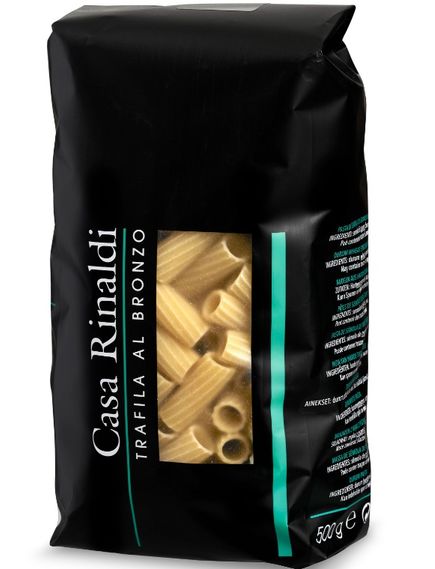 Паста Casa Rinaldi представляє найвищі італійські традиції та досвід. Кожен формат виробляється за допомогою стародавнього методу бронзової витяжки: це процес, під час якого тісто, виготовлене з манного борошна та води, пропускається шляхом екструзії через бронзові витяжки, які надають макаронним виробам шорсткості та тілесності. Далі серія лез відрізає виріб до потрібної довжини. Нарешті слід фаза сушіння, яка виконується повільно та при низьких температурах.
