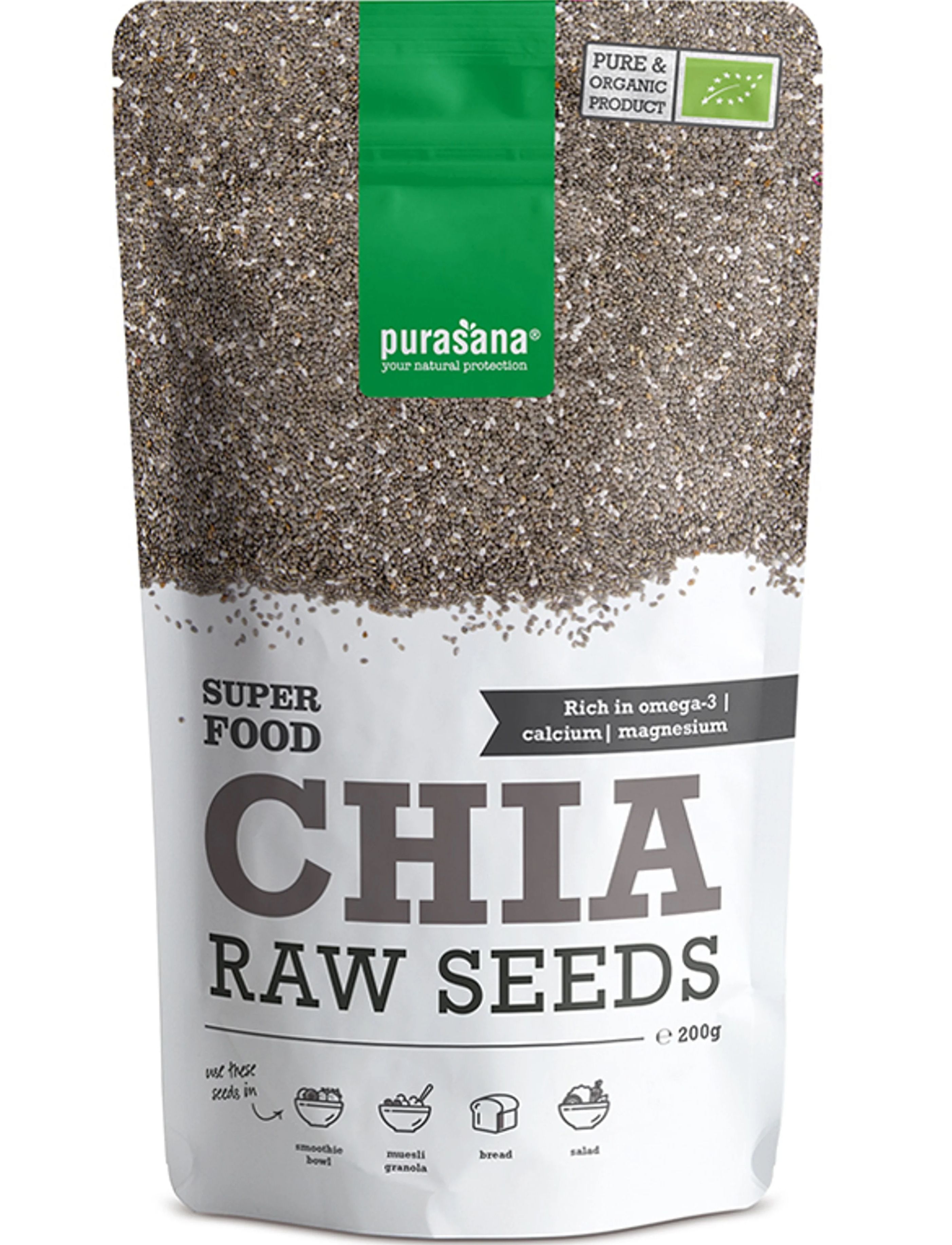 Чіа - це трава, яка росте в Південній Америці. Насіння протягом століть було важливим продуктом харчування. Чіа природним чином містить численні поживні речовини та фітонутрієнти в оптимальному співвідношенні поживних речовин і поживних речовин. Насіння чіа є джерелом омега-3 і містять кальцій, магній і мідь. Приготуйте чіа-пудинг або додайте його в смузі.