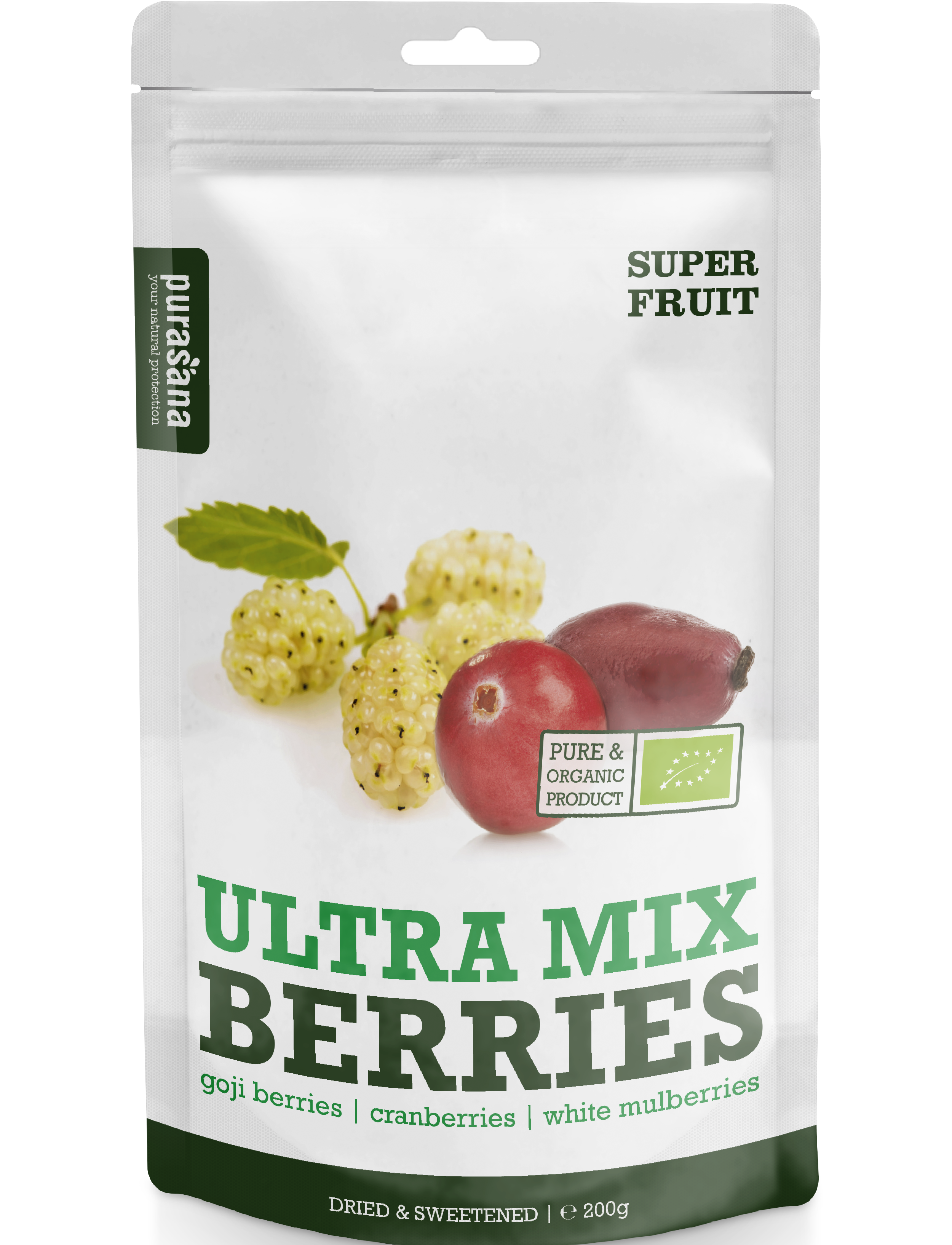 Сушені ягоди годжі (Lycium barbarum), сушена та підсолоджена журавлина (Vaccinium macrocarpon) і сушена біла шовковиця (Morus alba). З органічного землеробства. Ягоди містять багато корисних поживних речовин. Наприклад, ягоди годжі містять багато вітаміну С, вітамінів групи В, клітковини та антиоксидантів. Журавлина багата вітаміном С, магнієм і клітковиною, а біла шовковиця багата залізом, кальцієм і антиоксидантами.