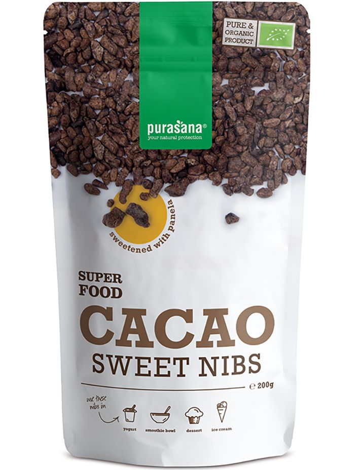 Purasana Sweet Cacao Nibs містить сирі какао-крупки, підсолоджені панелою , без будь-яких додаткових добавок. Продукт сертифікований як органічний, веганський і кошерний , а також не містить алергенів глютену, лактози та сої.