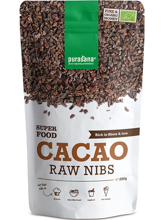 Purasana Raw Cocoa Nibs містить 100% сирих шматочків какао без будь-яких додаткових добавок. Продукт сертифікований як органічний, веганський і кошерний, а також не містить алергенів глютену, лактози та сої.