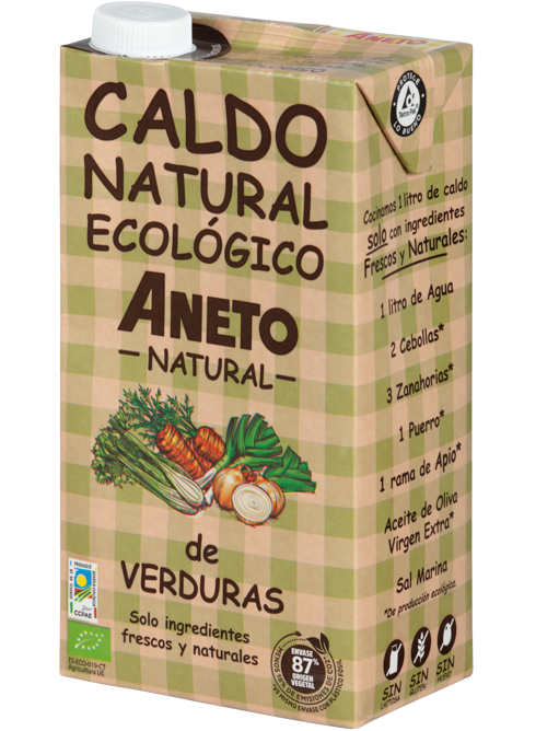 Повністю натуральні бульйони Aneto готуються з високоякісних овочів, морської солі та оливкової олії та варяться на повільному вогні більше трьох годин. На відміну від інших бульйонів на ринку, у нашому бульйоні не використовуються концентрати, ароматизатори чи порошки. Наш бульйон сертифікований без ГМО. Отриманий продукт є ситним бульйоном або основою для приготування супів, рагу, різотто та паельї.