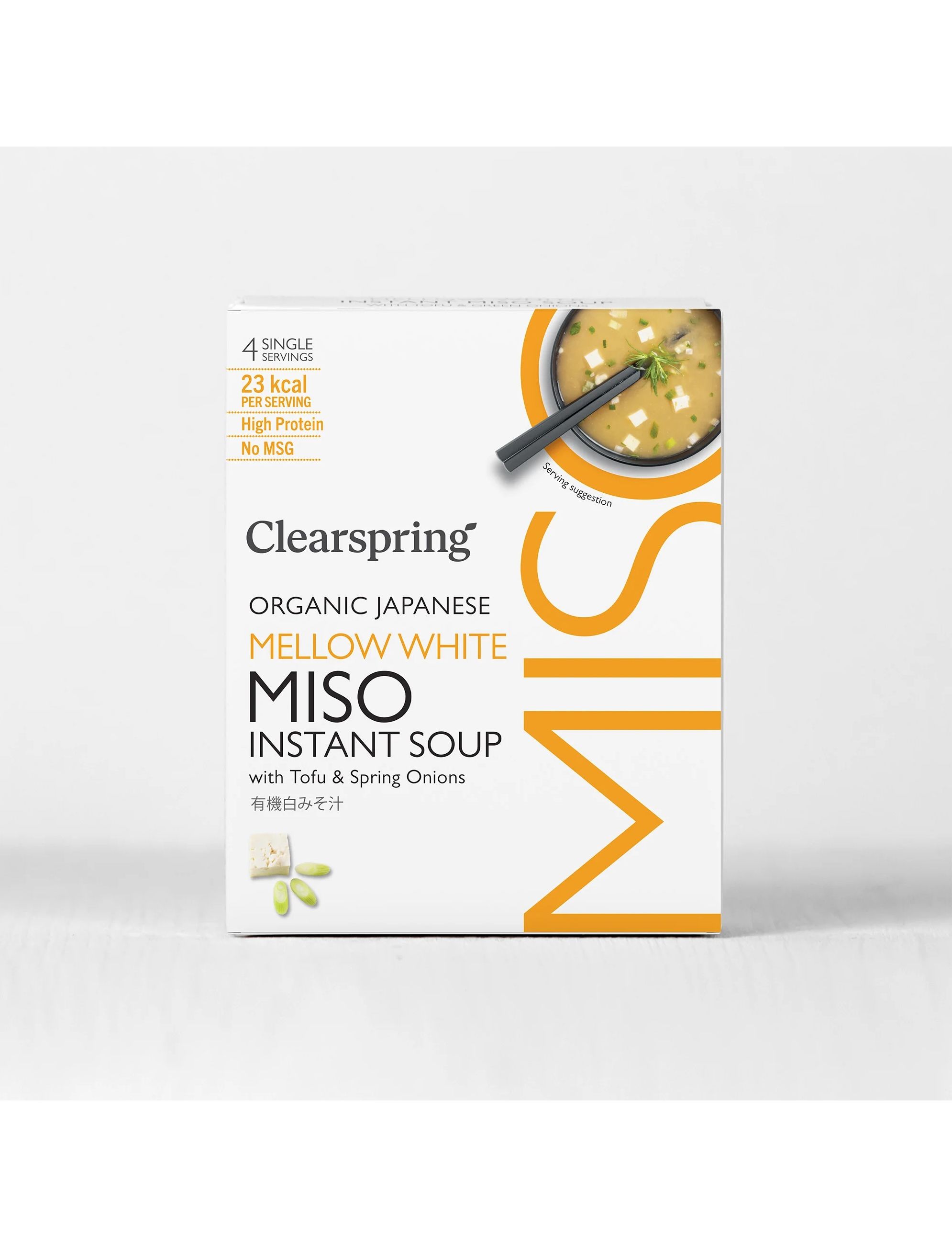 Органічний суп з білого місо Clearspring Mellow White виготовляється нашим виробником у п'ятому поколінні в Японії, який використовує свій досвід, щоб надати місо з коричневого рису винятково насиченого умами та ніжної солодкості. Він не містить доданого цукру та штучних ароматизаторів, постачається у вигляді зручного сублімованого порошку та містить тофу та зелену цибулю для додаткової текстури та смаку. Просто додайте гарячої води, щоб насолодитися смаком Японії.