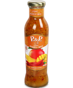 Склад: вода питна, цукор, манго заморожене 5 %, томатна паста, загущувачі: крохмаль модифікований та камідь ксантанова, сіль кухонна, овочі сушені та спеції (перець солодкий, перець чилі  0.43 %, часник), регулятори кислотності: кислоти оцтова та лимонна, зерно гірчиці (білої та чорної),...